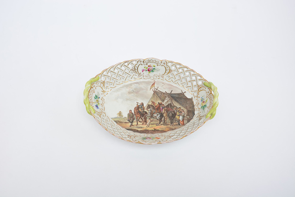 Centrotavola in porcellana a bordo traforato decorato nel cavetto ad accampamento. Bordo con riserve di fiori policromi. Anse a rami intrecciati (cm 24)