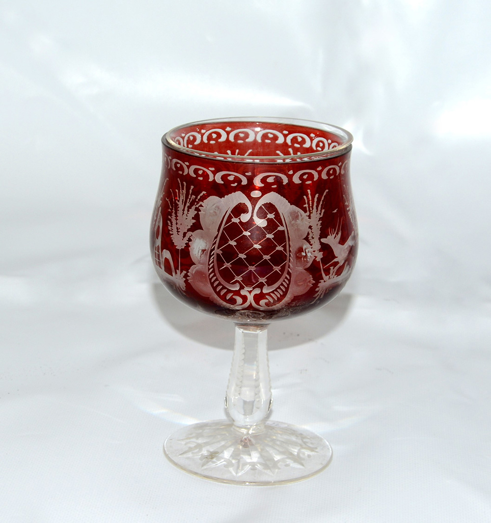 Manifattura di Boemia. Coppa portacaviale in vetro decorato con animali e motivi vegetali