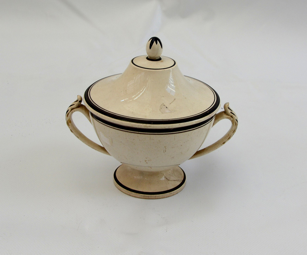 Manifattura del sec. XIX. Piccola zuppiera biansata con coperchio in ceramica bianca con profili marroni (lievi difetti)