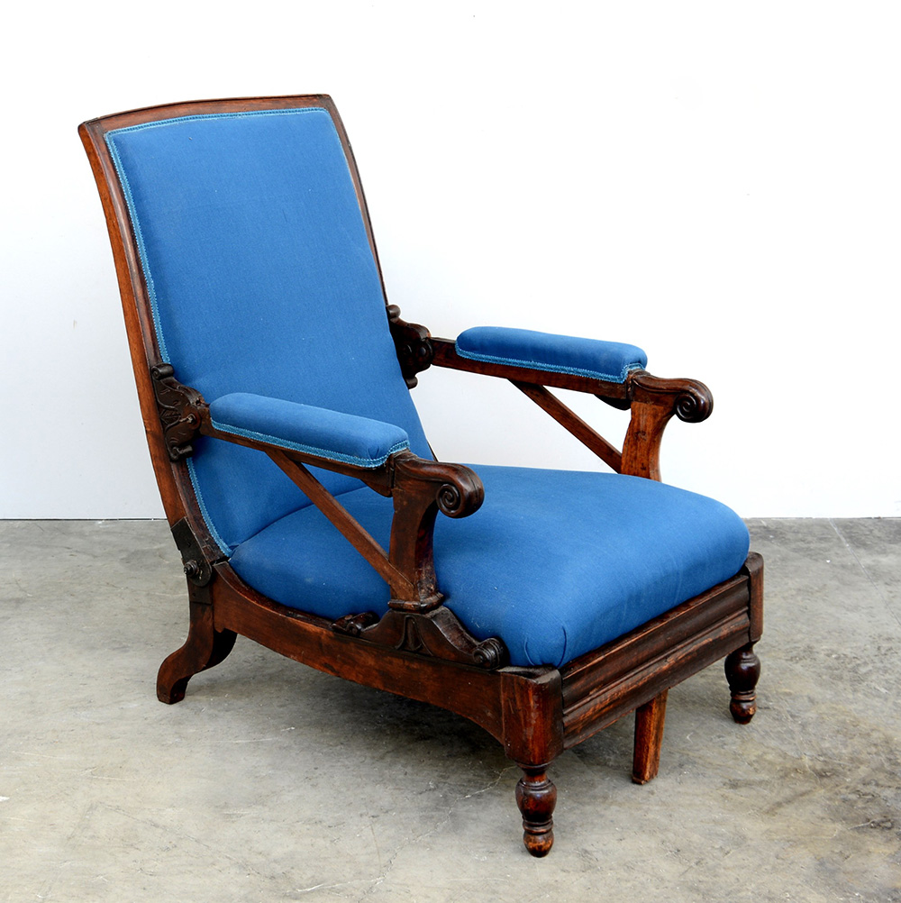 Poltrona con schienale reclinabile in noce con braccioli e montanti sagomati...