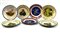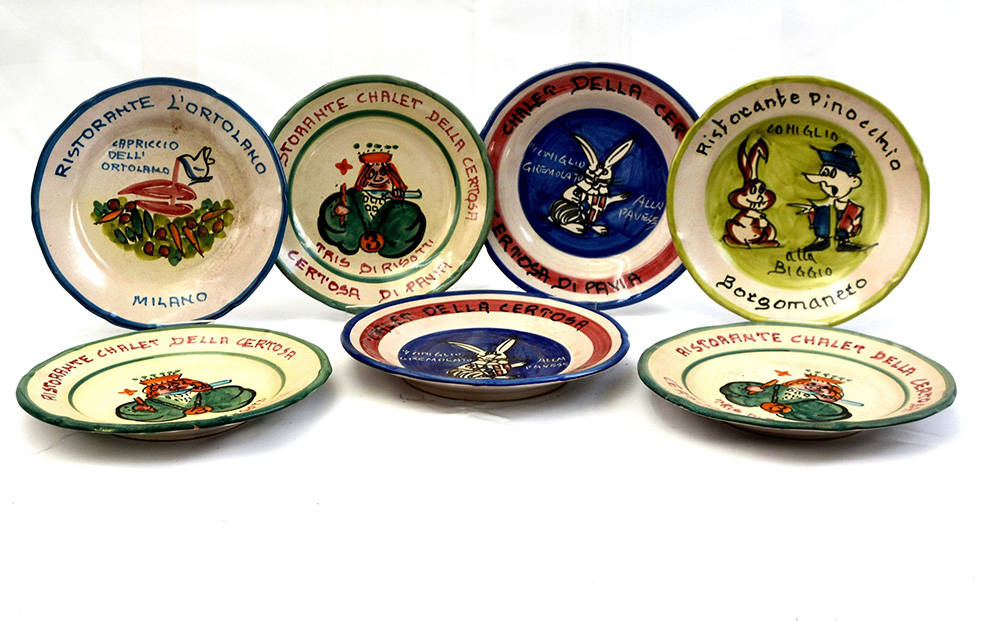 Gruppo di sette piatti del buon ricordo in ceramica policroma (difetti)