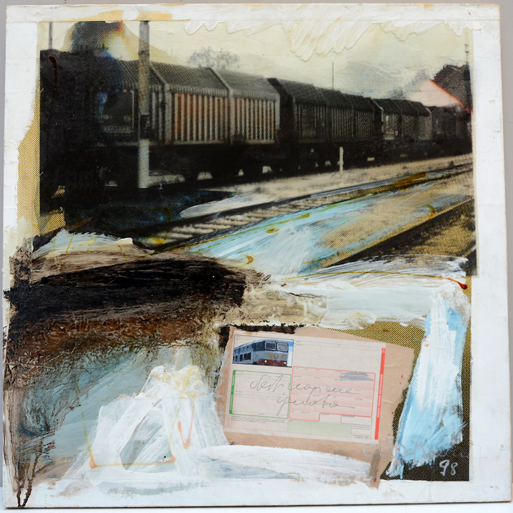 Firma indecifrata "Composizione astratta" 1998, tecnica mista e collage su carta applicata su compensato (cm 70x70) firmato e datato al verso, reca etichetta ArteInvest "Del Donno Antonio" al verso (lievi difetti)