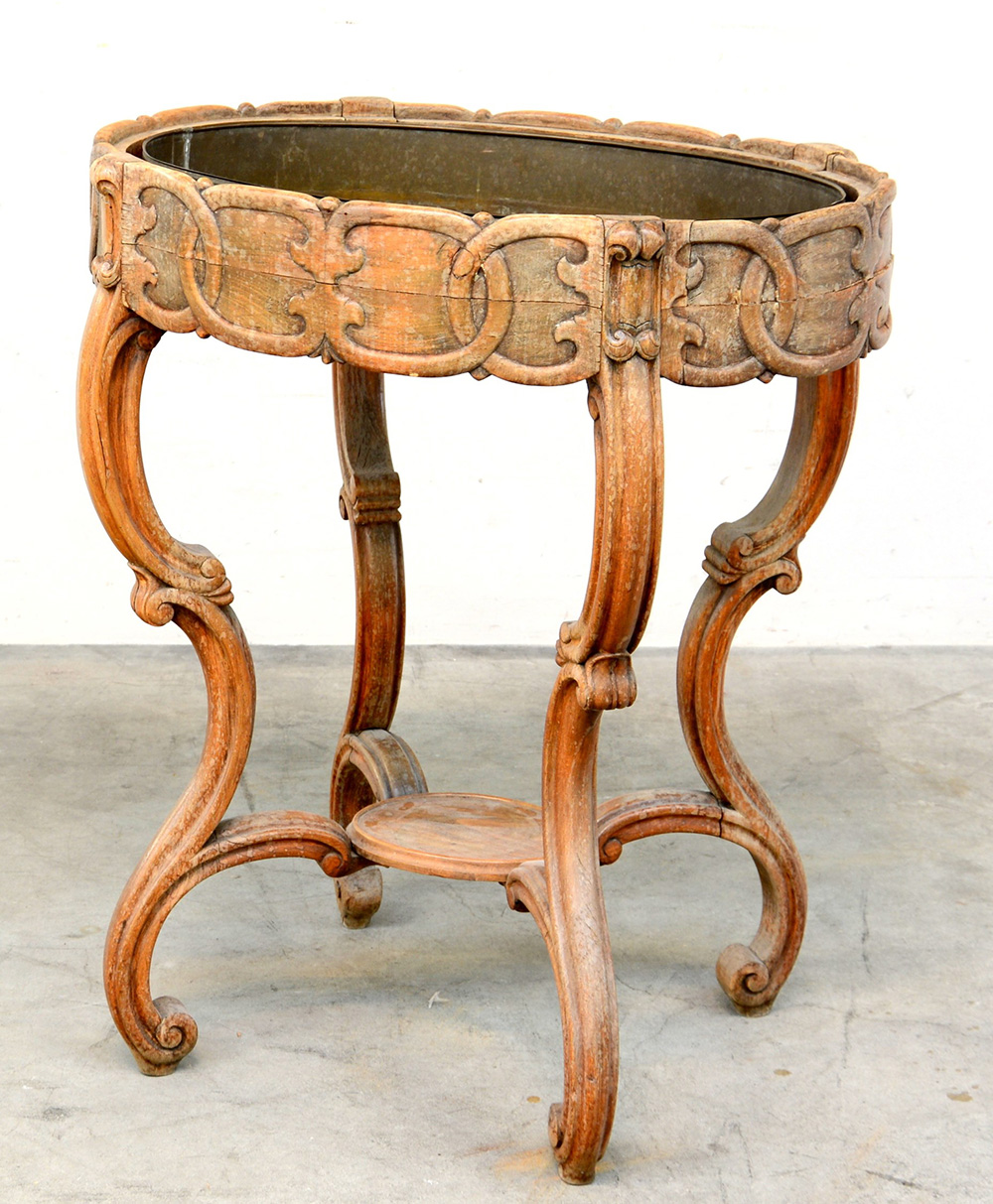 Fioriera ovale con fascia intagliata a motivi vegetali, gambe sagomate riunite al centro da pianetto ovale. Inizio sec. XX (cm 73x85x57)(difetti)