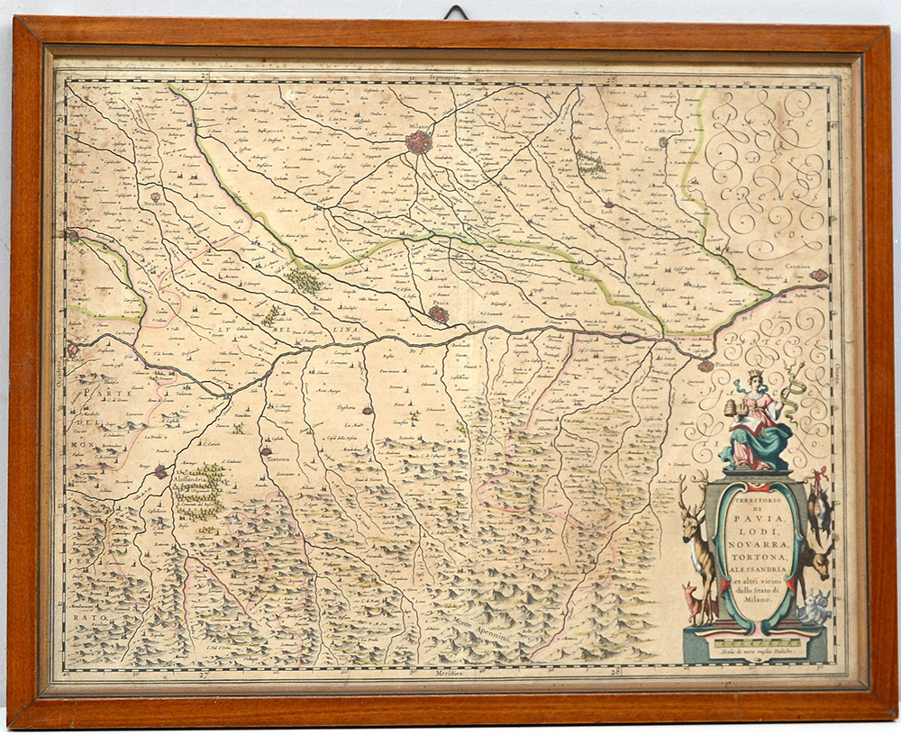 Antica carta geografica a colori raffigurante i territori di Pavia, Lodi, Novara e Tortona. In cornice