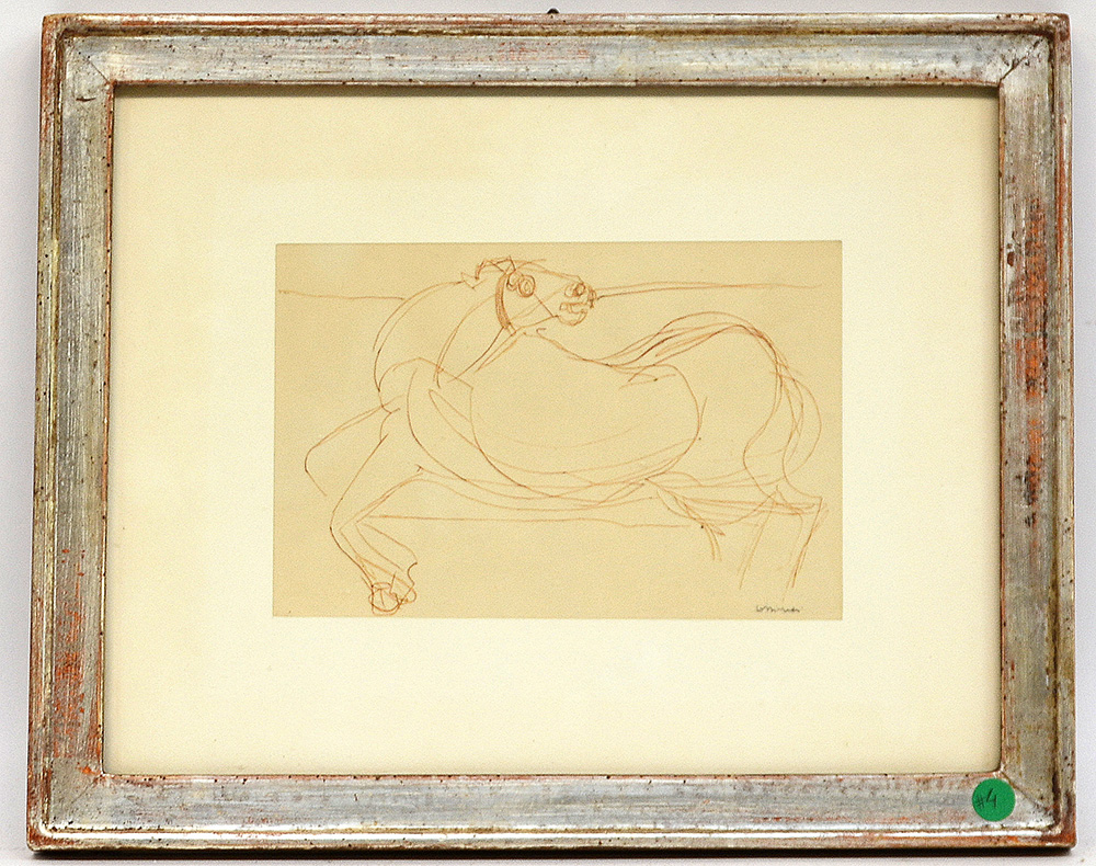 Ignoto, "Cavallo" 1965, disegno a penna su carta (cm 13.5x19.5) firmato in basso a destra. Etichetta al retro della galleria d'arte Bambaia di Busto Arsizio, in cornice