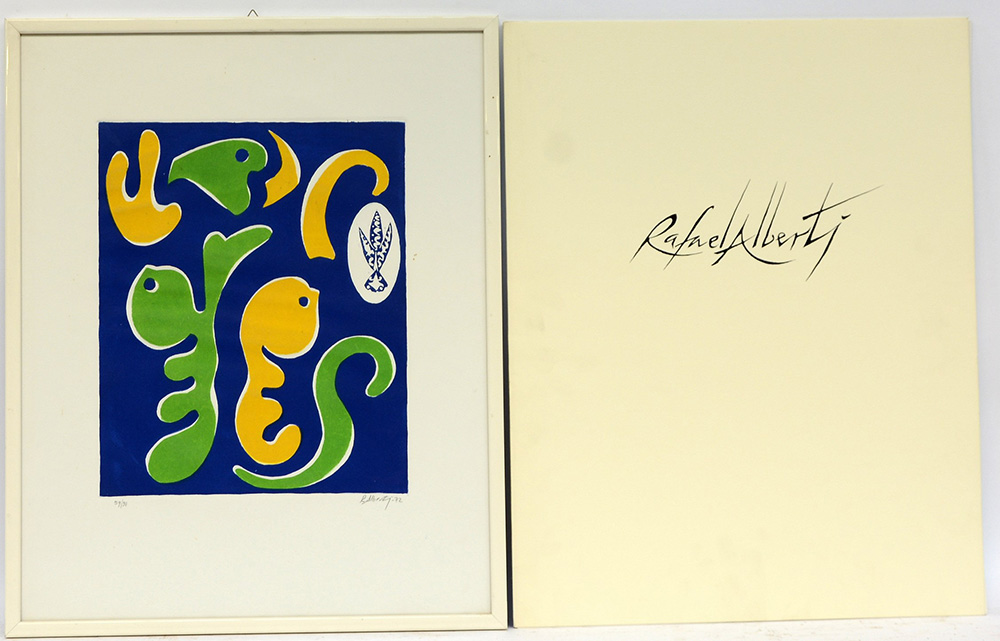 Rafael Alberti (1902 - 1999) "La donna lucertola" 1972, acquatinta a colori, numerata 59/90, firmata e datata in basso, con relativa cartella editoriale (cm 55,5x43,4). (Lievi difetti)