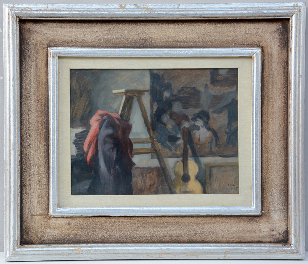 Firma indecifrata "Interno" 1965, olio su cartone (cm 30x40). In cornice