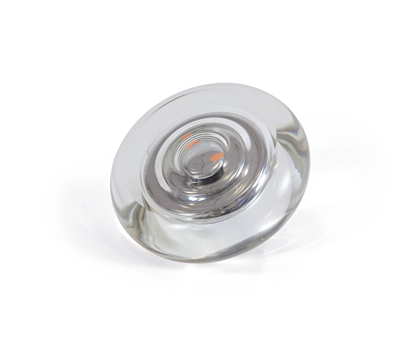 SOTTSASS ETTORE - Raro orologio in cristallo specchiato con supporto in metallo cromato. Articolo promozionale realizzato per Olivetti, 1975 circa. Diam. cm 18