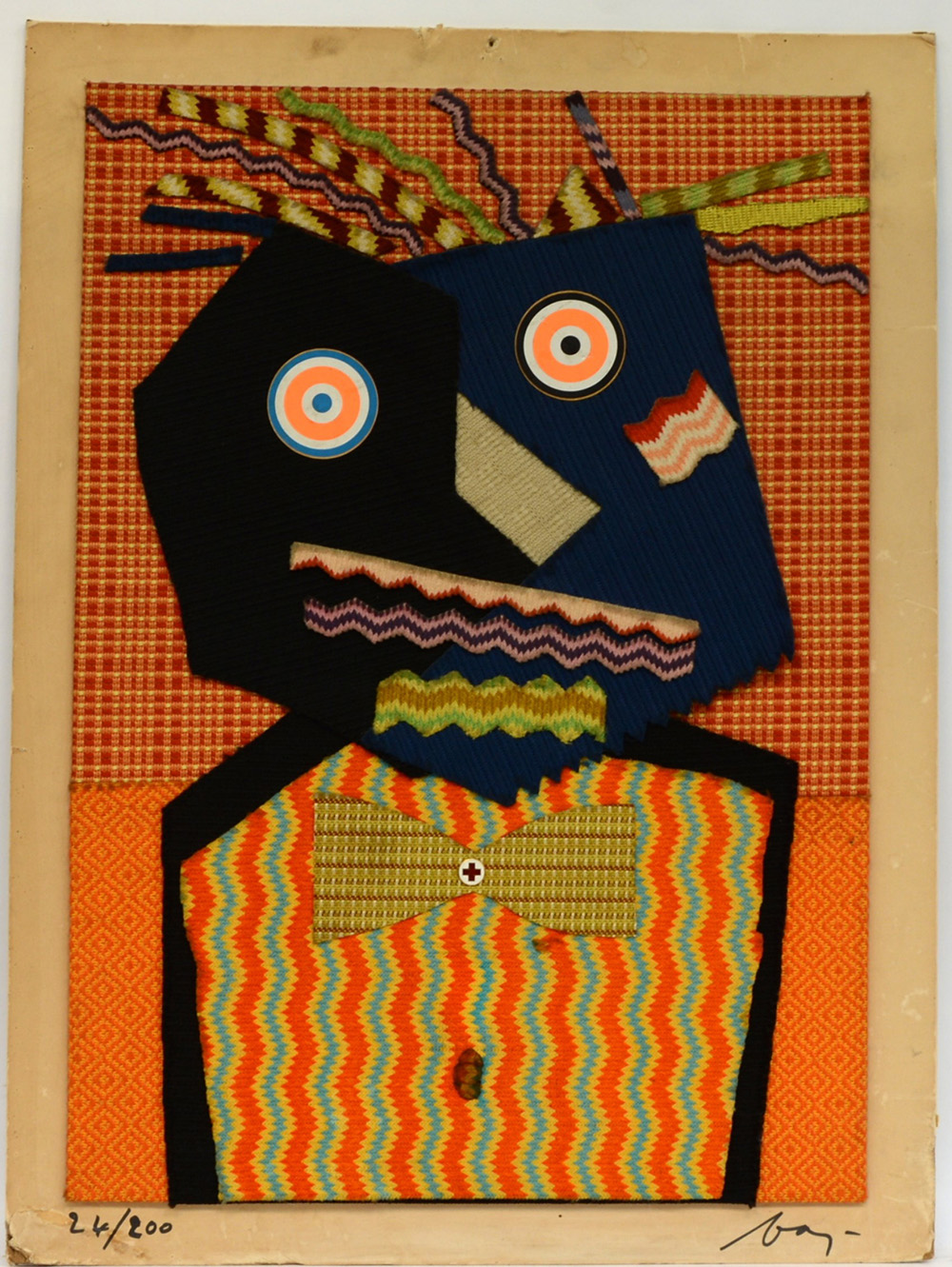 Enrico Baj (Milano 1924 - Vergiate 2003) "Mr. Dupont de Nemours" 1969, multiplo realizzato con tessuti M24 della Du Pont (cm 78x57,5), firmato e numerato 24/200 in basso. Etichetta al retro (difetti e mancanze)