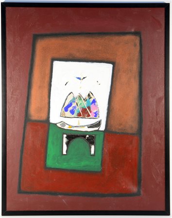 Giannici Celano "Il dono della luce sul ponte del tempo" 1991, tecnica mista su tela (cm 90x70). Firmato, datato e intitolato al retro. In cornice (difetti)