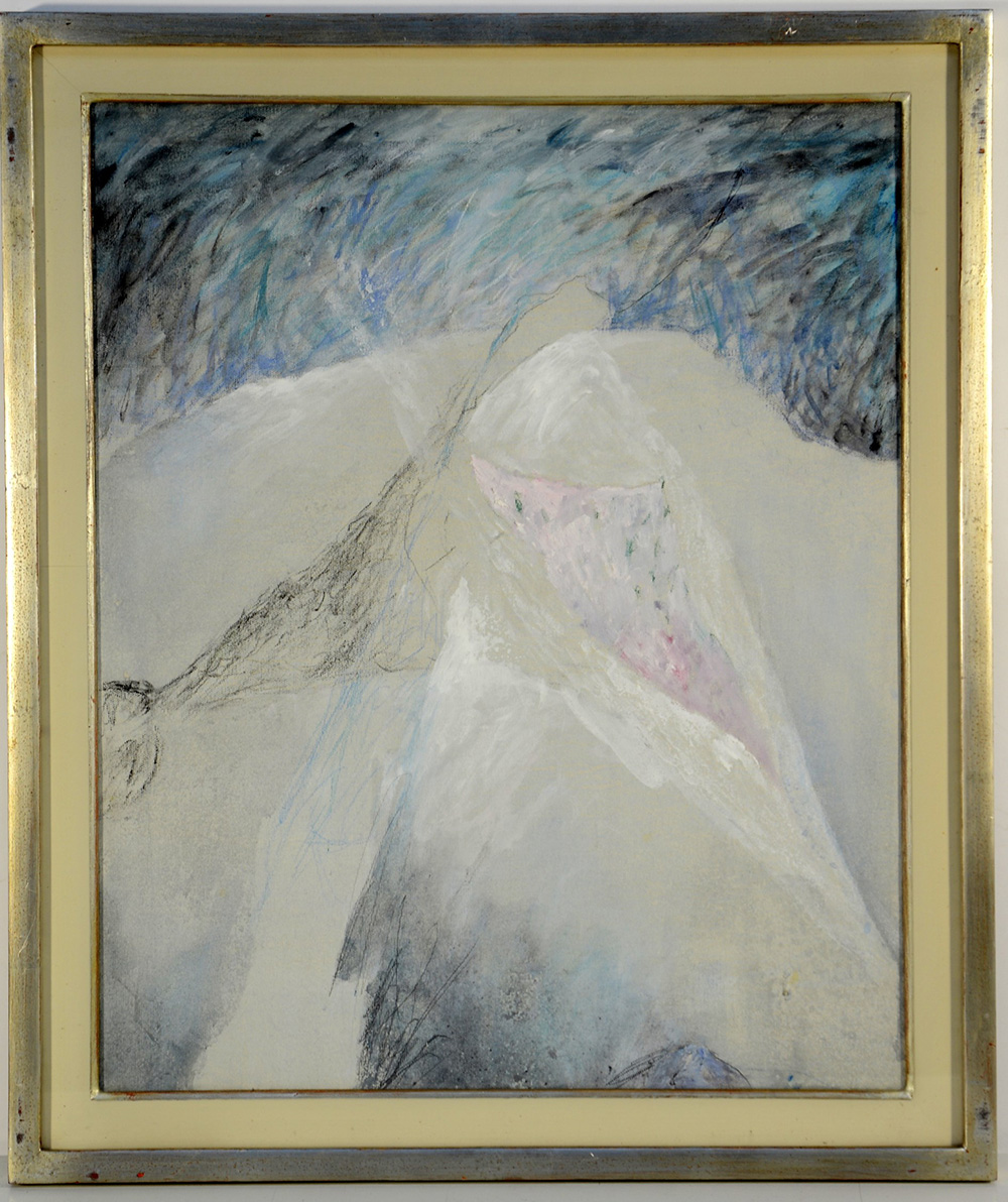 Mario Raciti. "Senza titolo" 1981 tecnica mista su tela, (cm 60x49). Firmato e datato al retro e sulla cornice timbro: "Scheda n. 544/ Mario Raciti". In cornice (difetti)