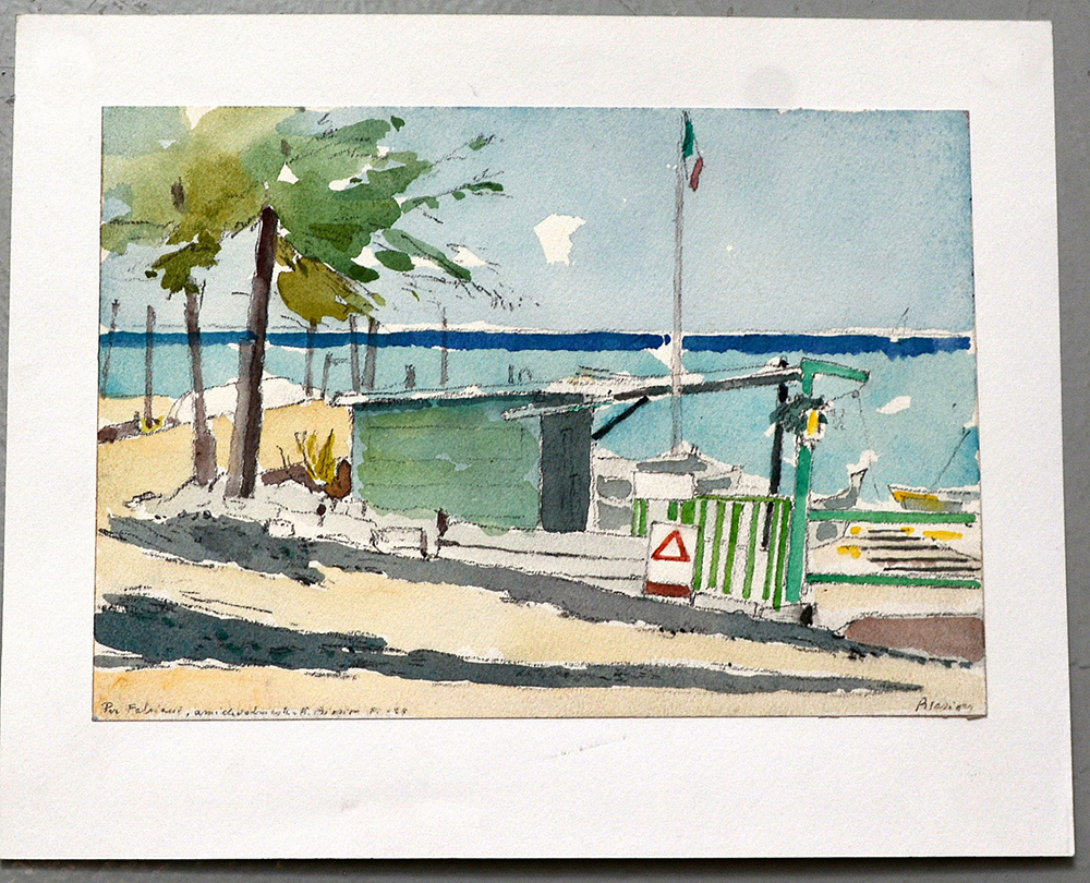 Biasion Renzo "Senza titolo" acquerello su carta (cm 7,5x25) montato su cartoncino. Dedicato e firmato in basso a matita.(Lievi difetti)