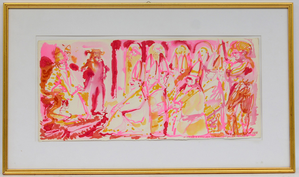 Aligi Sassu (Milano 1912 - Palma De Mallorca 2000) "Senza titolo" 1919, acquarello su cartoncino (cm 24,5x54). Dedicato, datato e firmato in basso. Opera accompagnata da autentica su fotografia dell'Archivio Aligi Sassu n. 79IN008 del 17/01/2014. In cornice (lievi difetti)