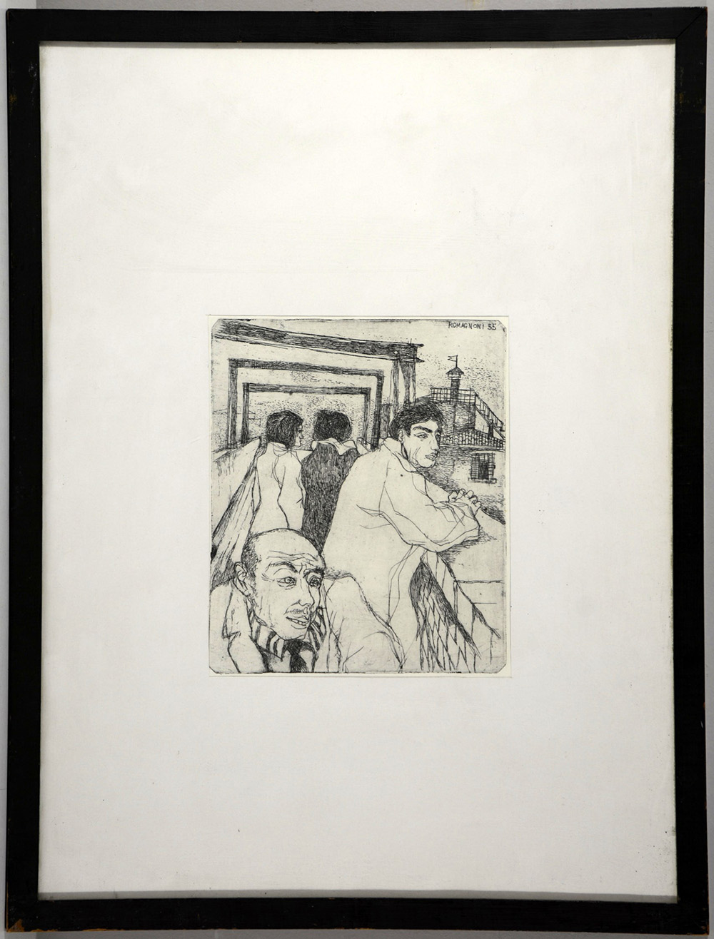 Bepi Romagnoni (Milano 1930 - Villa Simius 1964) "Figure", acquaforte (cm 23x19, l'impressione), firmata e datata in lastra. In cornice