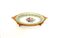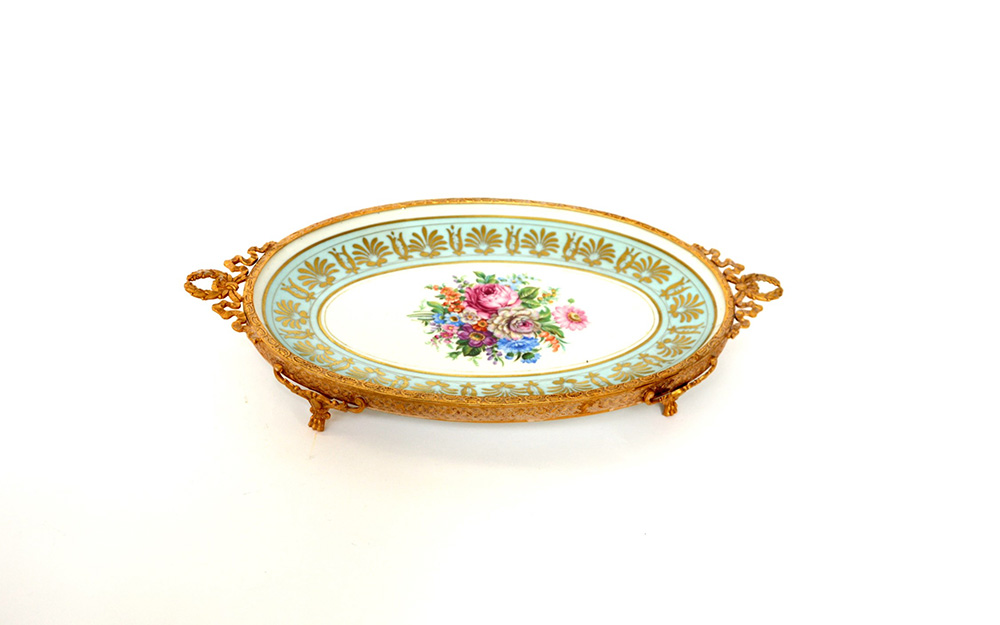 Manifattura francese, centrotavola ovale con piedini e ringhiera in metallo dorato a motivi classici, piatto in porcellana decorato in policromia con mazzo di fiori e palmette, marcato sotto la base (cm 35x4x20) (lievi difetti)