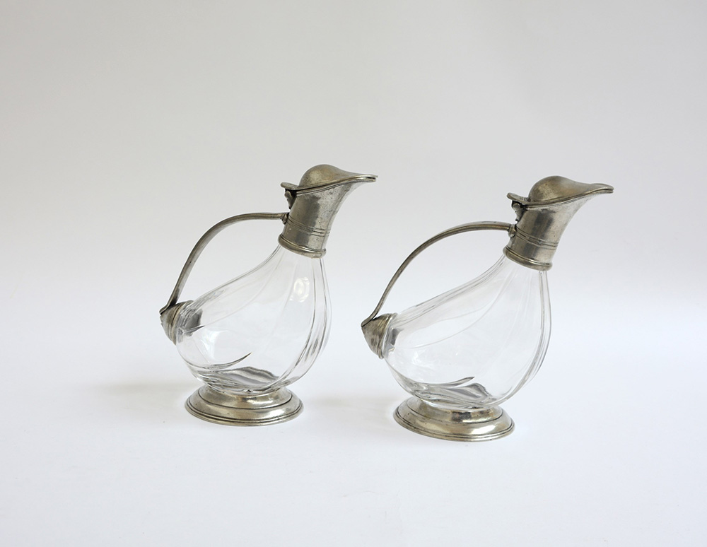 Lotto di due versatoi da tavola a forma d'anatra stilizzata, in vetro e peltro (lievi difetti)