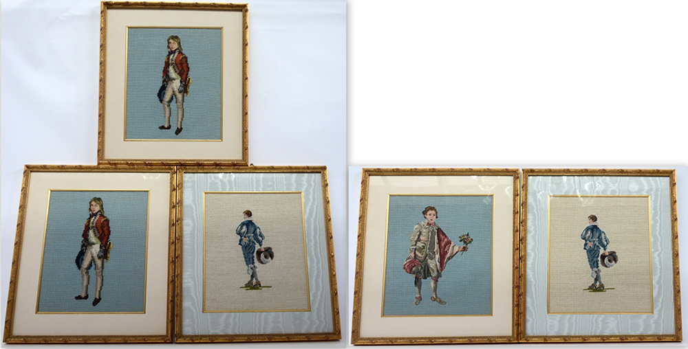 Gruppo di cinque ricami a piccolo punto raffiguranti personaggi d'epoca (cm...