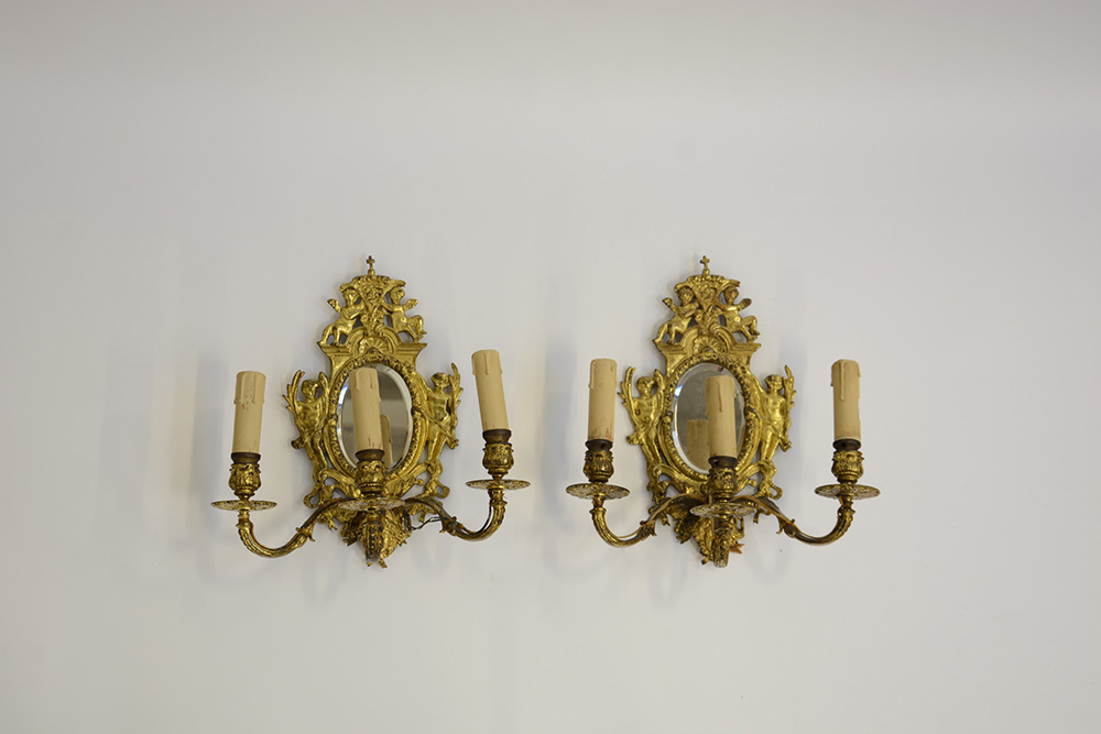 Coppia di appliques a tre fiamme in metallo dorato con fondo a specchio entro cornice decorata a putto (h. cm 30)