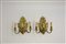 Coppia di appliques a tre fiamme in metallo dorato con fondo a specchio entro...