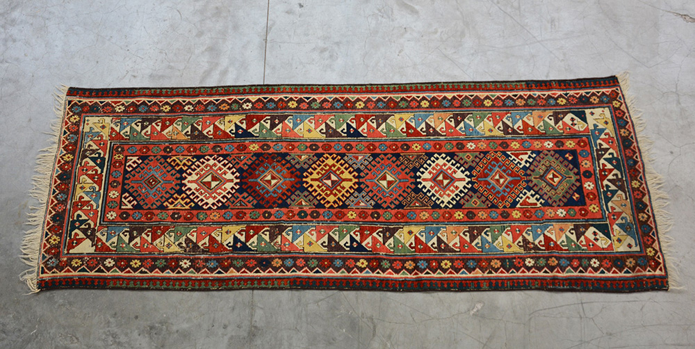 Tappeto GandjiË, Caucaso secolo XIX. Disegno a piccoli medaglioni uncinati policromi su fondo blu (cm 265x95) (difetti e restauri)