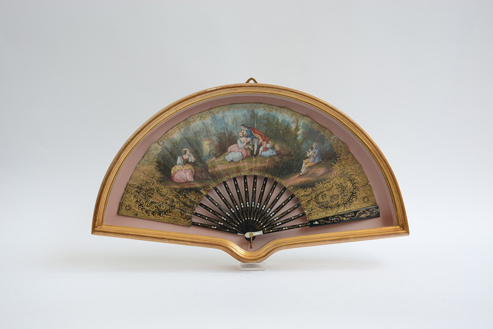 Ventaglio con pagina decorata con scena bucolica in un paesaggio su carta dipinta e dorata. Francia, sec. XIX. In teca (difetti)