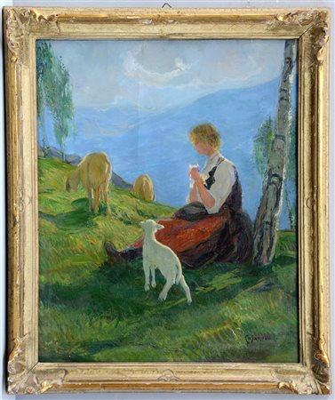 Carlo Casanova "La pastorella" olio su tela (cm 55.5x45) La tela Ë stata ripiegata orizzontalmente (cm complessivi 55.5x76) Reca due firme di cui una non coeva in basso a destra. In cornice (difetti)