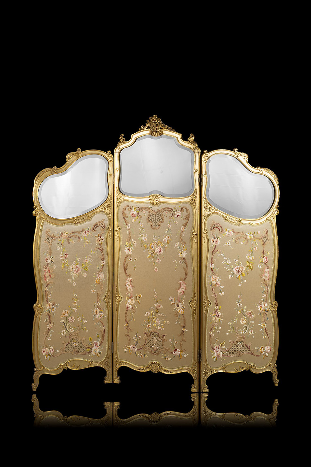 Paravento a tre ante in legno intagliato e dorato a fiori e volute, pannelli in seta ricamata a motivi vegetali (cm 170x180)