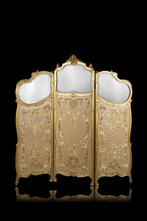 Paravento a tre ante in legno intagliato e dorato a fiori e volute, pannelli...