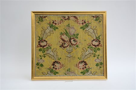 Frammento di broccato in seta e fili d'argento per parati raffigruante vaso e cornucopie fiorite su fondo giallo, secolo XIX (cm 50x50) In cornice