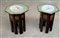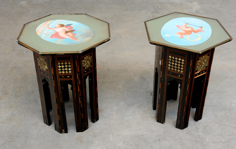 Due tavolini moreschi, uno di forma ottagonale l'altro esagonale in legno intarsiato in madreperla e legno chiaro a motivi geometrici, piani decorati a tempera su carta raffiguanti putti. Sec. XIX (dimensioni diverse) (difetti)