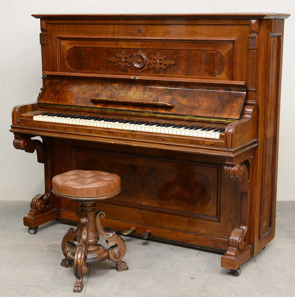 Pianoforte verticale di Theodor Steinweg, Braunschweig 1940 c., 85 tasti, due pedali, intarsio sul frontale ´GROTRIAN, HELFERICH, SCHULTZ / TH. STEINWEG NACHF. / BRANSCHWEIGª. Con sgabello