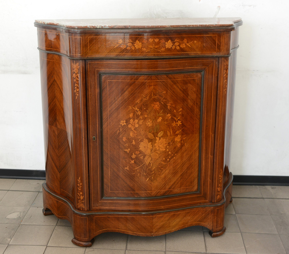 Credenza lastronata in mogano di forma mossa con fronte intarsiato in legni vari a mazzi fioriti, piano in marmo (cm 115x110X43) (lievi difetti)