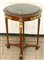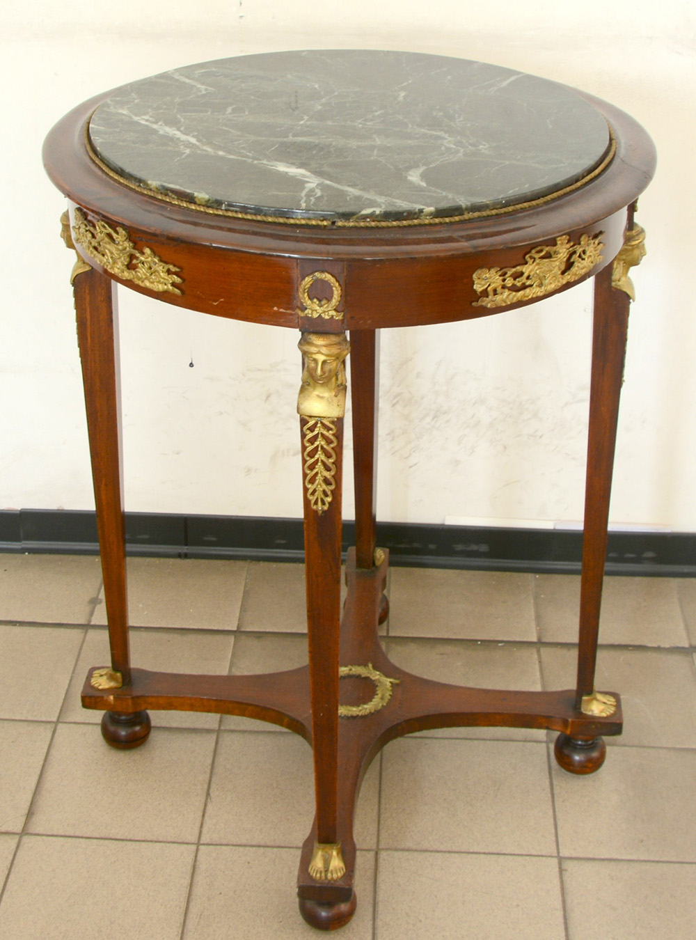 Tavolino da centro in noce stile impero con quattro montanti e fasce decorate da applicazioni dorate, piano in marmo verde (d. cm 60x80) (difetti)