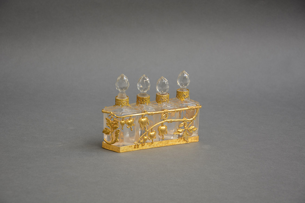 Manifattura del sec. XIX. Gruppo di quattro bottiglie di forma sfaccettata con ghiera in metallo dorato e docorato con foglie e campanule