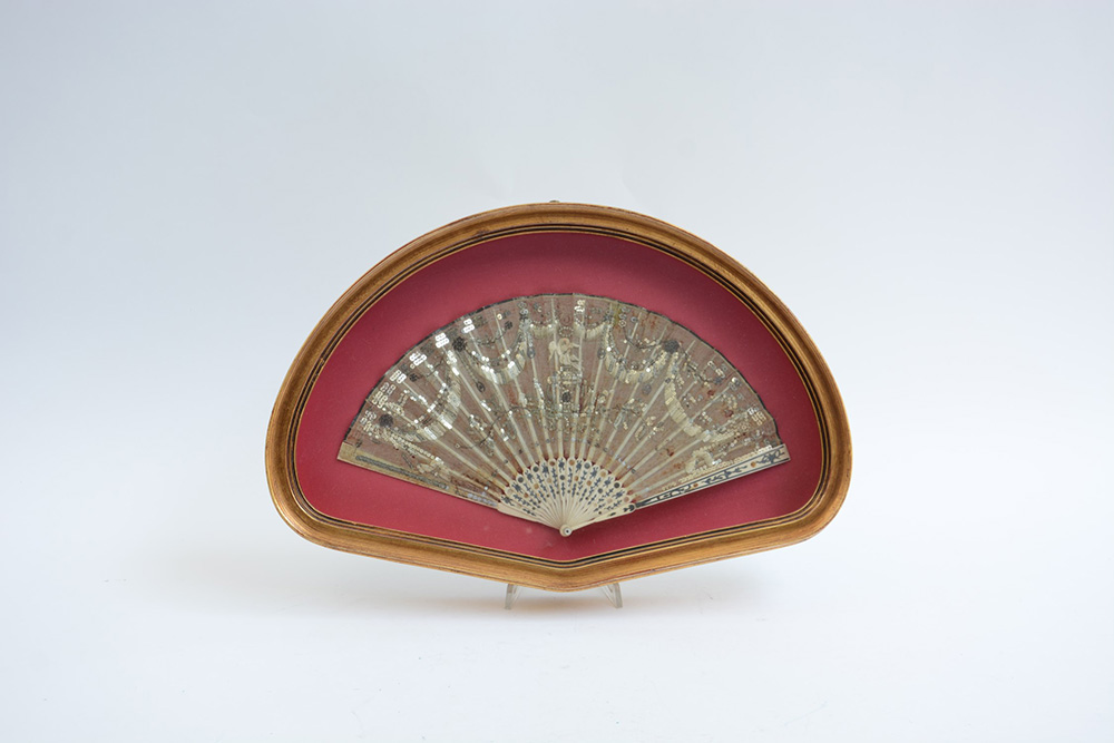 Ventaglio con stecche in avorio decorato con fregi argentati, pagina in pizzo decorata a paillettes e volatili. Sec. XIX, contenuto in teca di epoca posteriore