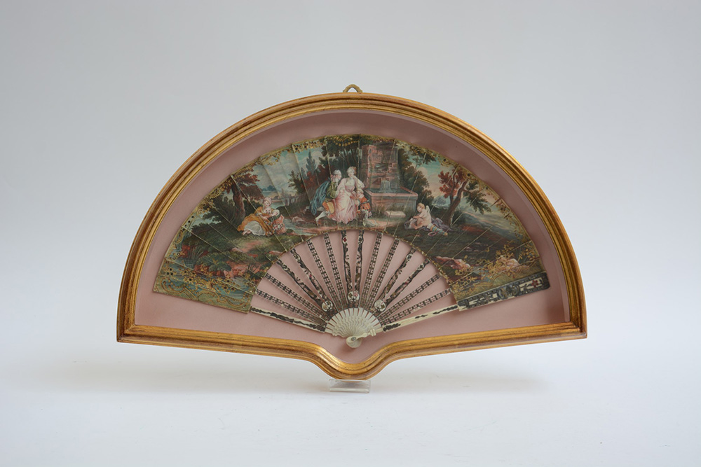 Ventaglio con pagina in carta dipinta con scena romantica, stecche in avorio inciso e traforato decorate a fiori e volatili. Francia, sec. XIX, in teca di epoca posteriore (difetti)