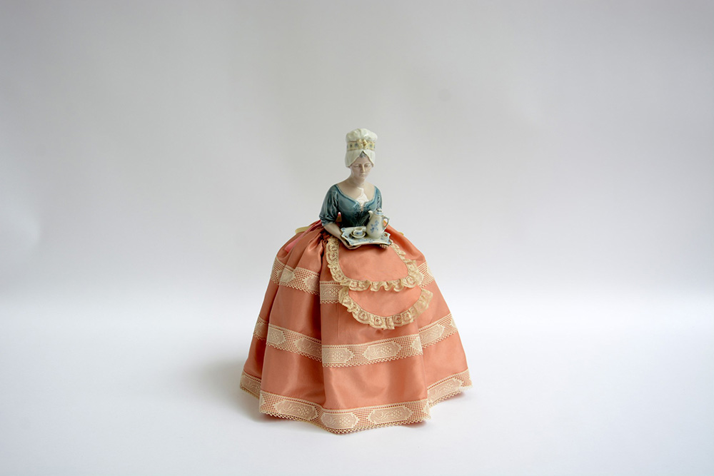 Bambola con corpo in porcellana con veste in raso e pizzo