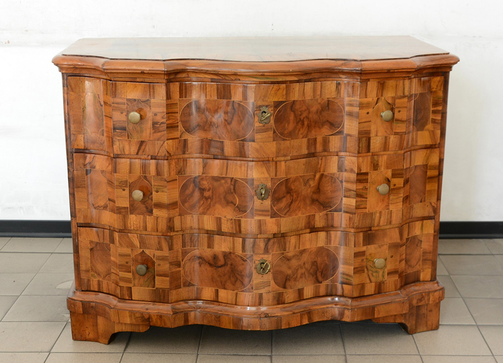 Antico cassettone di forma mossa a tre cassetti pannellati in radica, piedi a mensola (cm 107x80x60) (difetti)