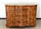 Antico cassettone di forma mossa a tre cassetti pannellati in radica, piedi a...
