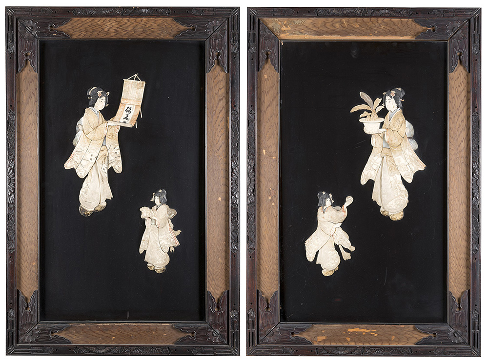 Due pannelli in lacca nera con decorazioni in avorio di dame con giovani assistenti (difetti) Giappone, Periodo Meiji (1868-1912) (35,5x60 cm.)
