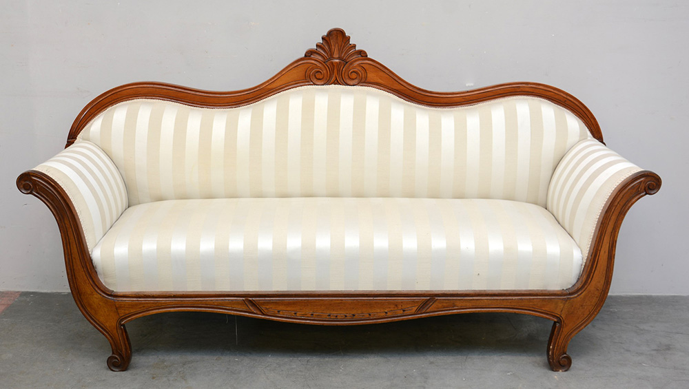 Divano a barca in noce con schienale sagomato centrato da fregio intagliato. Braccioli e gambe terminati a ricciolo. Rivestimento a righe. Fine sec. XIX (cm 200x105x61)