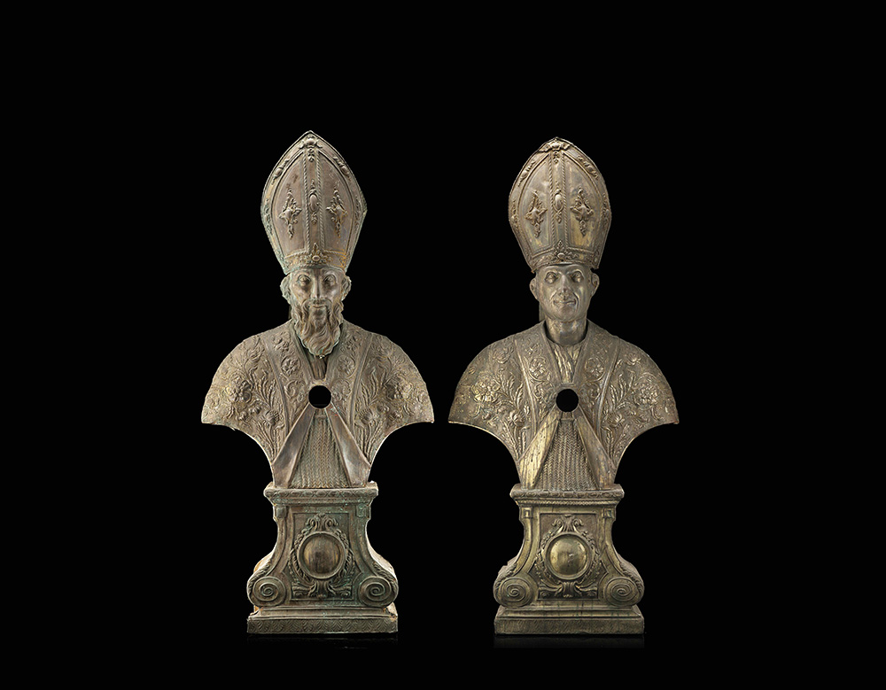 Arte del sec. XVIII. Coppia di reliquiari a mezzo busto di vescovi in rame...
