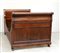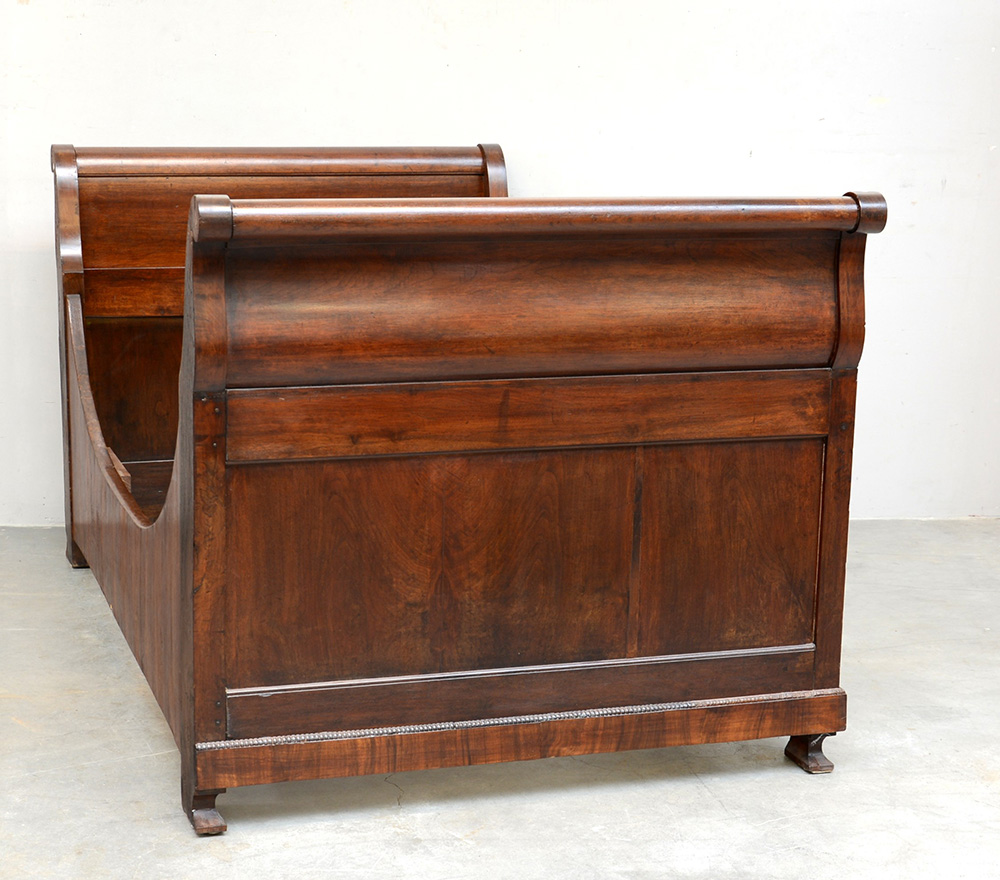 Letto a barca da parete in noce. Montanti intagliati a volute e fregi, base a piccola baccellatura. Sec. XIX