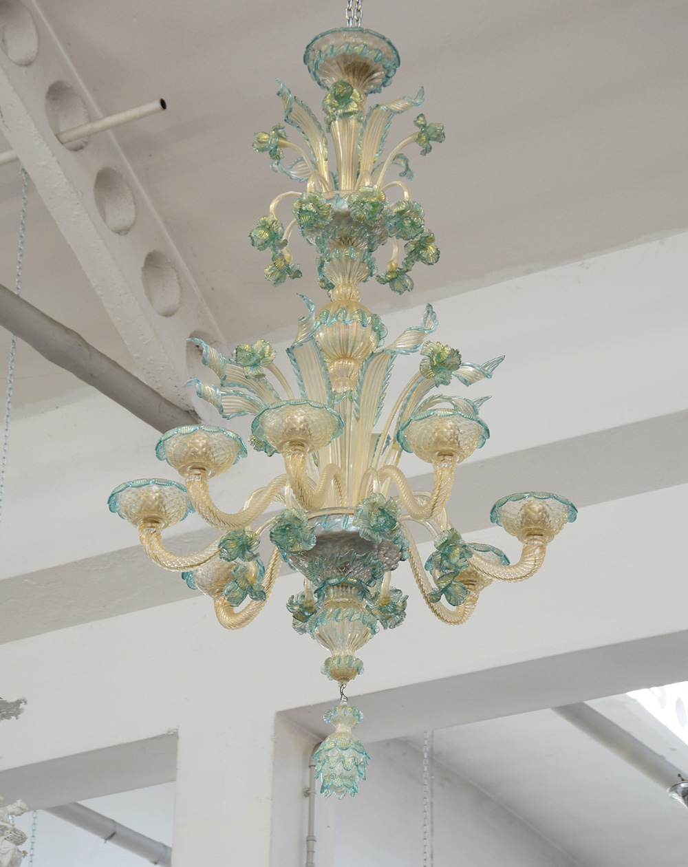 Manifattura di Murano. Lampadario a otto luci in vetro con braccia e foglie sagomate decorato nei toni del blu e con dorature (h. cm 160)