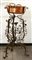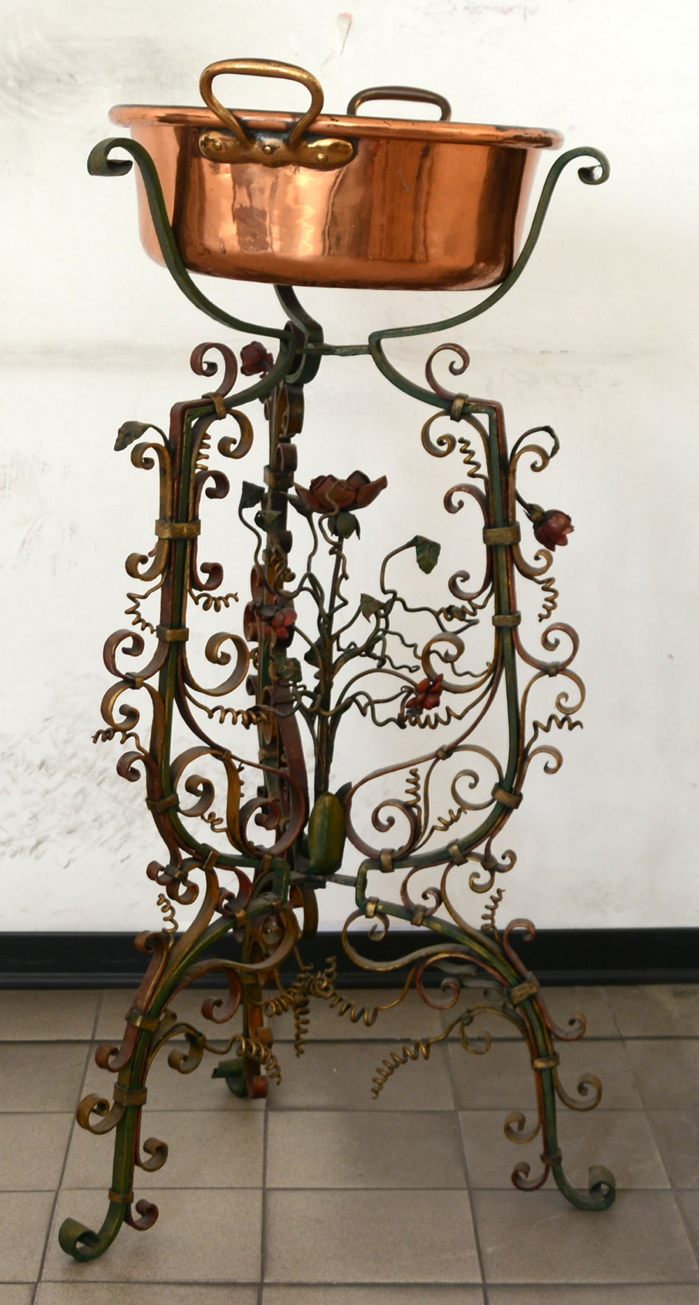 Fioriera in ferro battuto decorata in policromia e dorature a fiori e volute, vasca biansata in rame non coeva