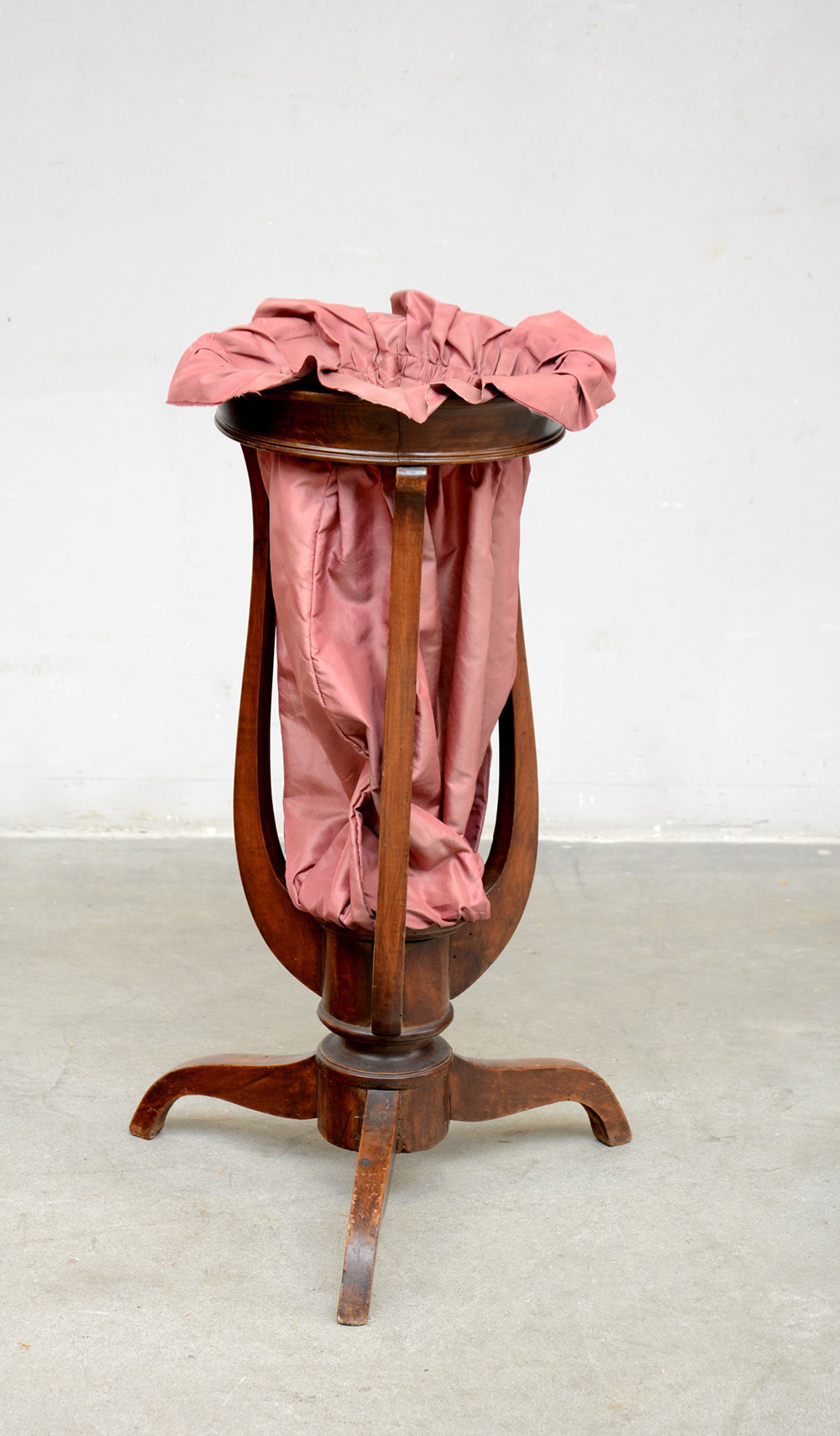 Cestino da lavoro in noce di forma tonda con gambe e montanti sagomati. Sec. XIX (h. cm 66 x d. cm 30)
