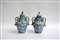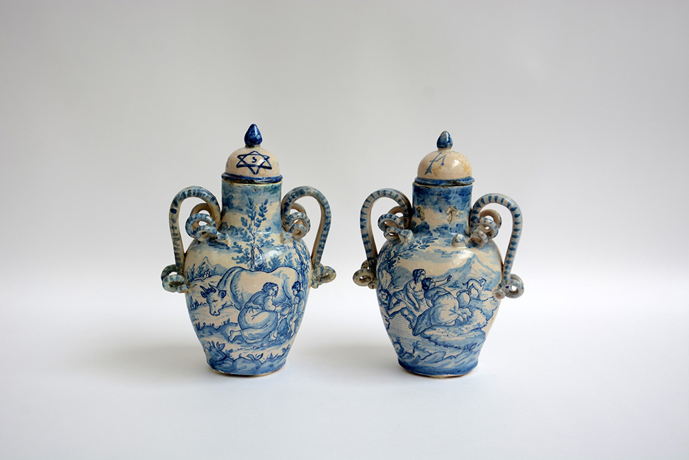 Manifattura ligure sec. XVIII. Coppia di vasi in terracotta smaltata decorati nei toni del blu a scene rurali, anse in rilievo a serpenti avviluppati (h. cm 32) (difetti e restauri)
