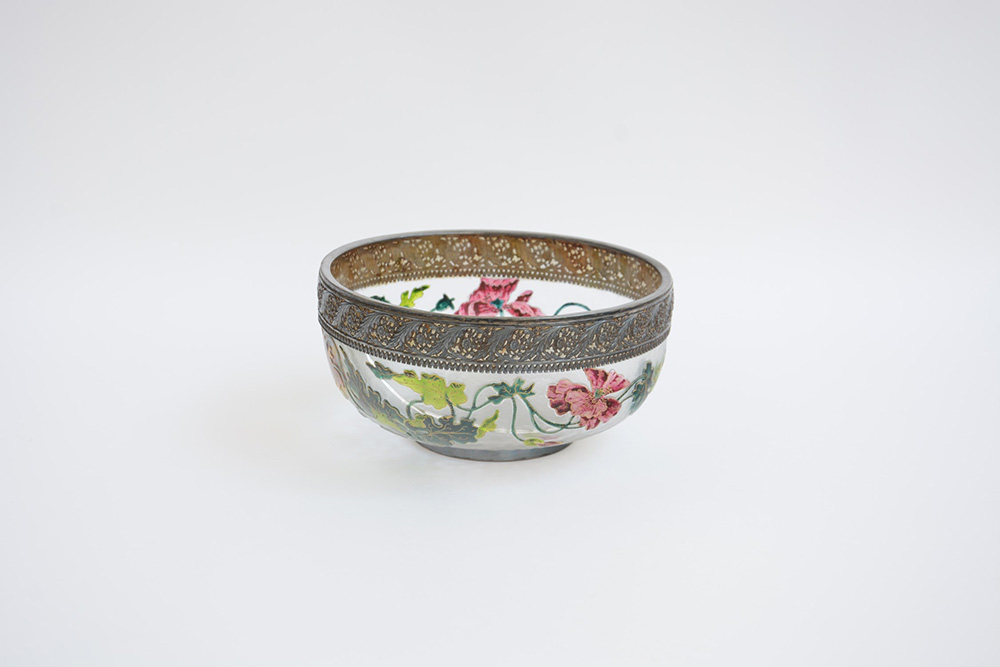 Lotto 1419 | Ciotola in cristallo decorata a rilievo a fiori in policromia, ghiere in...