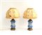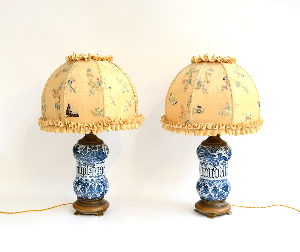 Due lampade in maiolica decorate a finti albarelli nei toni del blu, con base e ghiera in ottone, paralumi in seta ricamata a fiori e farfalle (h. cm 55)