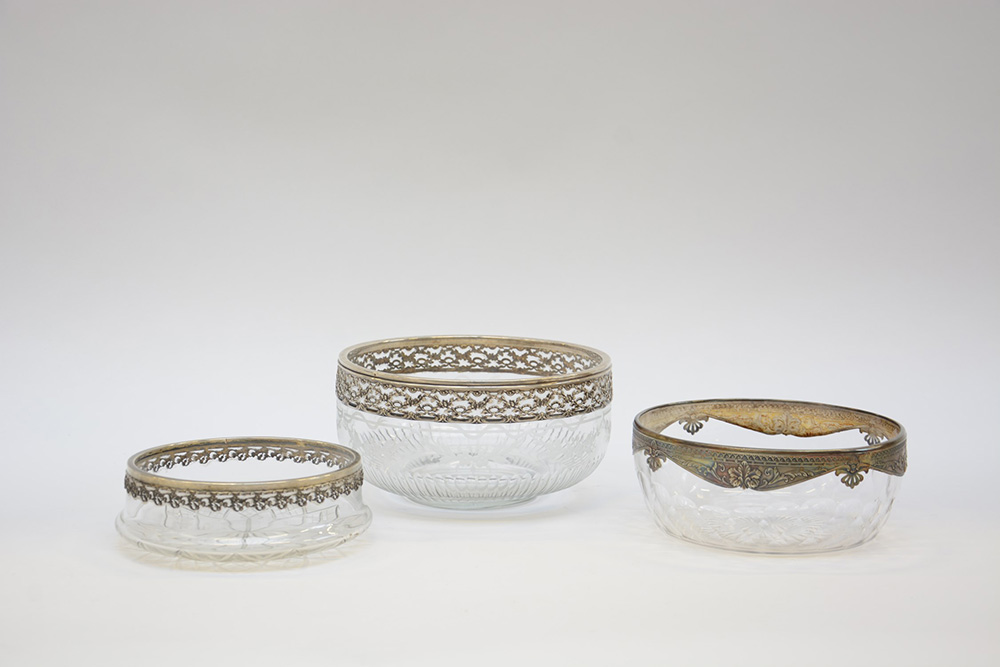 Lotto composto da una ciotola e due insalatiere in cristallo sfaccettato e vetro con ghiere in argento (lievi difetti)